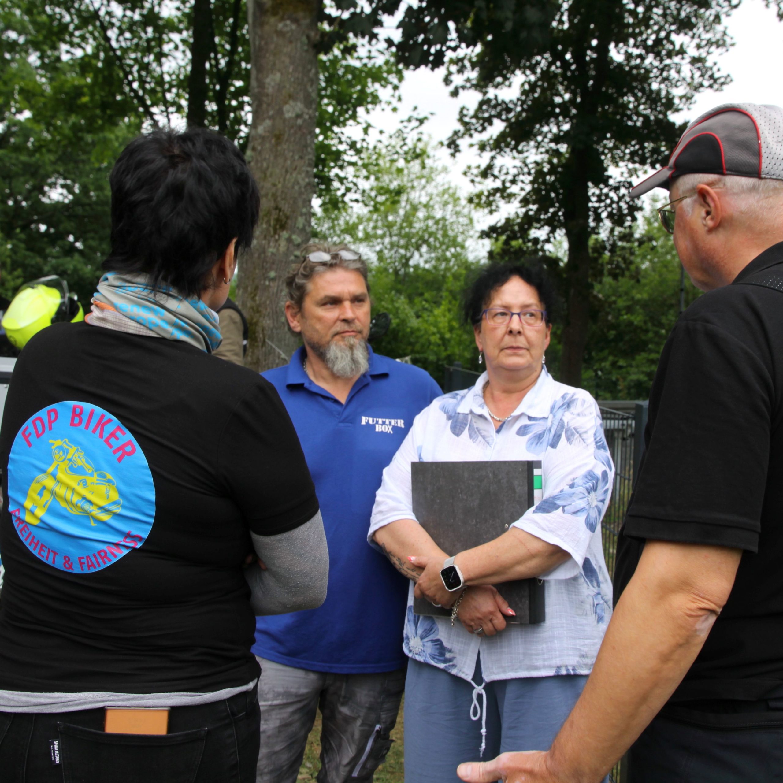 Doch es waren bereits Fakten geschaffen, der Zaun stand seit wenigen Tagen und die Delegation der FDP Biker beobachtete, wie zahlreiche Motorräder zwar zunächst am Biker-Treff anhielten, wegen des Zaunes jedoch keinen Parkplatz mehr fanden und unverrichteter Dinge weiterfuhren. Gerade einmal die Hälfte der eigentlichen Gästekapazität konnte ausgeschöpft werden – „absolut geschäftsschädigend!“ Der Streit um die Fläche wird weitergehen, aber ein erster Erfolg ist zu verbuchen: Die einstweilige Verfügung ist neutralisiert und die Betreiber dürfen die Fläche bis zum Prozess, nach der Kommunalwahl, erst einmal wieder nutzen – auch aufgrund der Impulse der FDP Biker…😉. Alfred Heidbrick bedankt sich für die gute Zusammenarbeit und betont: „Für mich ist dieses offene Tor ein gutes Symbol. Statt einfach Zäune zu ziehen und dicht zu machen, sollten wir Wege finden, ins Gespräch zu kommen. Natürlich müssen beide Seiten angehört werden, aber so etwas lässt sich nur mit Dialog lösen, nicht mit Schnellschüssen.“ Auch Götz Rinn, Bundesvorsitzender der FDP Biker aus Oberursel (Hessen), freut sich über den ersten Meilenstein: „Wir freuen uns erst einmal mit Claudia und Markus bzw. ihrem achtköpfigen Team, dass das Gelände nun wieder wie gewohnt genutzt werden kann, sind darüber hinaus aber natürlich auch weiterhin an der Seite der „FutterBox am See“ – Anruf genügt!“